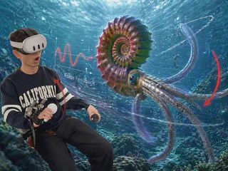 ISMAR 2025 で発表した本研究では、ユーザがアンモナイトのように人間とは大きく異なる体型のアバターに変身したときに、その身体らしい運動感覚を生み出す力覚フィードバックの設計を行いました。
