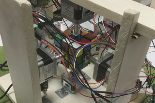 It uses two webcams to recognize the initial state of a Rubik’s cube and derives a solution using an existing solver. The six arms are rotated according to the method to complete the Rubik’s Cube.